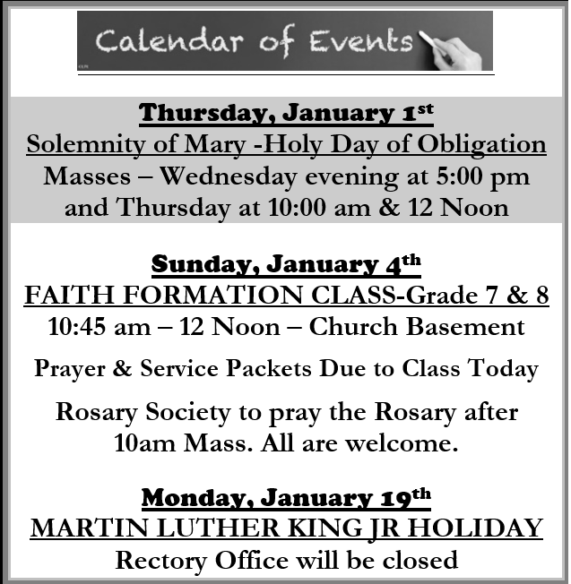There are several ways you can help support our parish and honor loved ones at the same time. As you may have noticed on the first Sunday of every month in our bulletin, we thank the donors of our Altar Gifts. You can donate the Bread & Wine, Altar Flowers, or the Sanctuary Lamp in a two-week block for $50 in someone’s memory. We have blocks open for this year. We also need to purchase a new Easter candle each year (the tall candle on the altar) for $300-$400 which can also be donated in someone’s memory. You do not have to fund the entire amount, anything you wish to donate towards the purchase of our Easter candle is appreciated. We also have masses available for your intentions. If you wish to honor someone in any of these ways, please call the rectory.