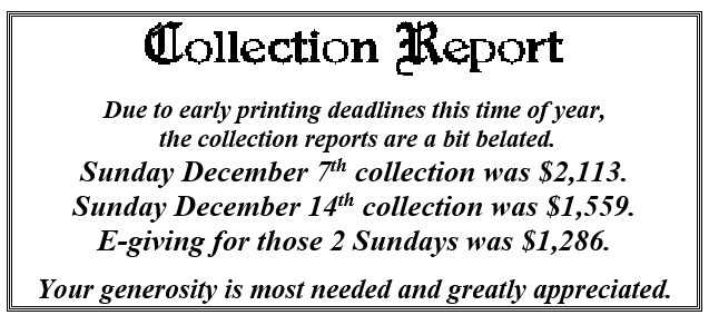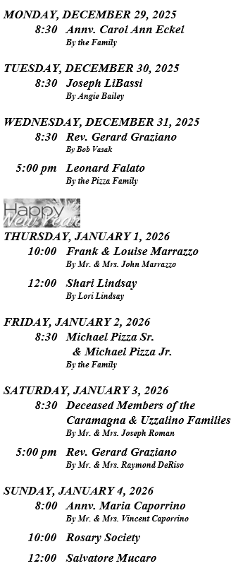 The Sanctuary Lamp for the first two weeks of December has been given in memory of Carmela & Augie Sylvestri by Jesse & Joanna Sylvestri. The second two weeks have been given in memory of Walter Eckel, Stanley Czlapinski, the Eckel Family and the DeMeo Family by Maryann Eckel.