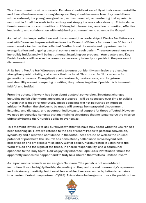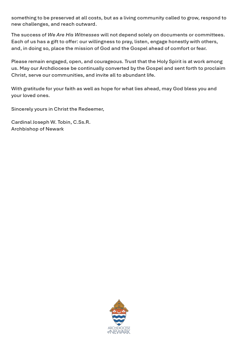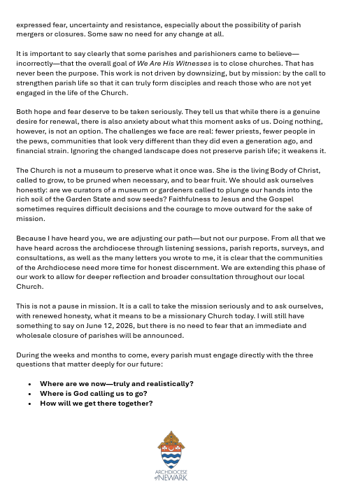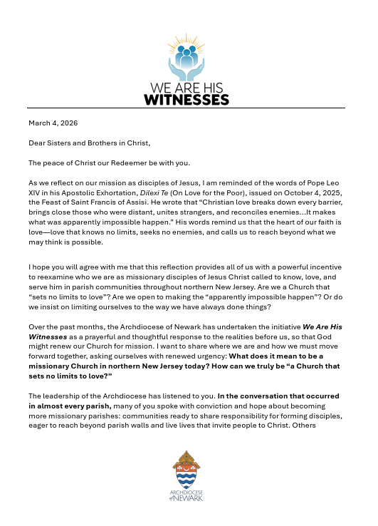 The Archdiocese is preparing for the annual tradition of honoring couples who will be celebrating their 5th, 25th, 50th, or 60+ wedding anniversary in 2026. The presence of these couples and their families is a beautiful witness to the strength and stability of Catholic marriage. Mass will be celebrated by Cardinal Joseph Tobin on Sunday, May 3, 2026 at 3pm at the Cathedral Basilica of the Sacred Heart in Newark. All family members are welcome! Please call the rectory if you are interested in attending this mass as pre-registration is required.