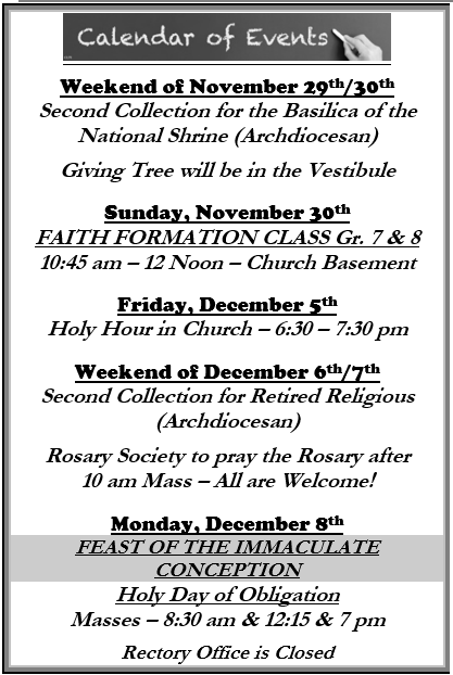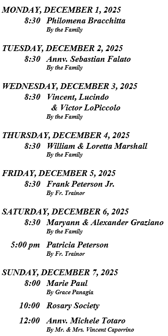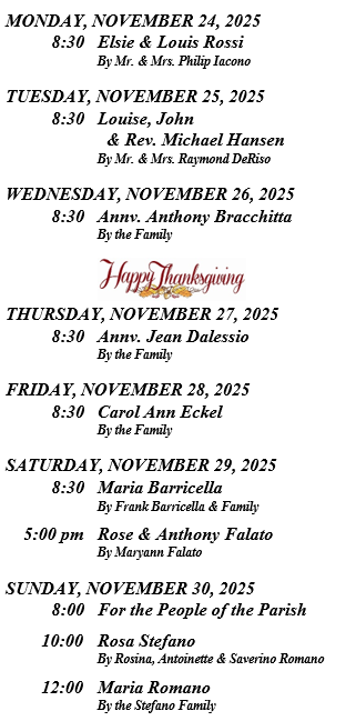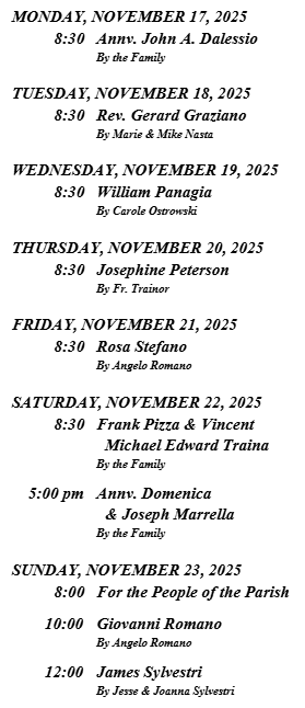 The gift of Bread & Wine for the first two weeks of November has been given in memory of Rose & Carmine DeRiso by Mr. & Mrs. Raymond DeRiso. The second two weeks have been given in memory of William Panagia by Rose-Ann Cella.