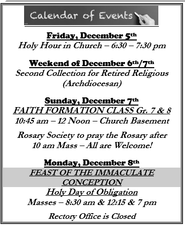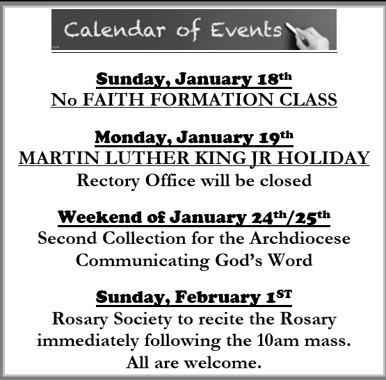 On the bulletin board in the vestibule is a list of seminarians. The Archdiocese is encouraging the faithful to send cards, letters, and well wishes to the seminarians. Take a picture of the list with your phone and send one (or more) of them a little uplifting message. Thank You!