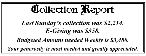 We would like to thank all the advertisers who have supported us throughout the past year. Our parish benefits greatly from the ads you see in the bulletin. The revenue pays for the printing which is an important means of communication for the parish. If we do not have enough advertisers, the cost of our bulletin goes up. We thank the local businesses that advertise with us especially in these tough economic times. We have some spaces on the back of our bulletin that need filling so if you would like to advertise your business as well as benefit your church, please contact John Patrick Publishing at 1-800-333-3166.