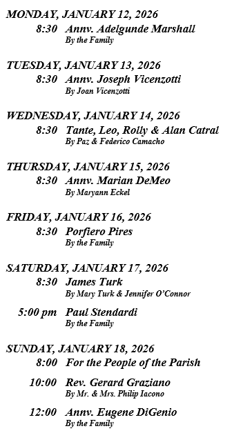 The Sanctuary Lamp for the first two weeks of December has been given in memory of Carmela & Augie Sylvestri by Jesse & Joanna Sylvestri. The second two weeks have been given in memory of Walter Eckel, Stanley Czlapinski, the Eckel Family and the DeMeo Family by Maryann Eckel.