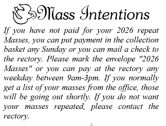 There are several ways you can help support our parish and honor loved ones at the same time. As you may have noticed on the first Sunday of every month in our bulletin, we thank the donors of our Altar Gifts. You can donate the Bread & Wine, Altar Flowers, or the Sanctuary Lamp in a two-week block for $50 in someone’s memory. We have blocks open for this year. We also need to purchase a new Easter candle each year (the tall candle on the altar) for $300-$400 which can also be donated in someone’s memory. You do not have to fund the entire amount, anything you wish to donate towards the purchase of our Easter candle is appreciated. We also have masses available for your intentions. If you wish to honor someone in any of these ways, please call the rectory.