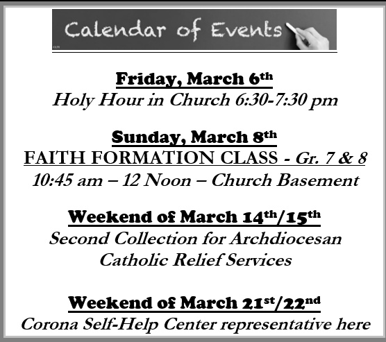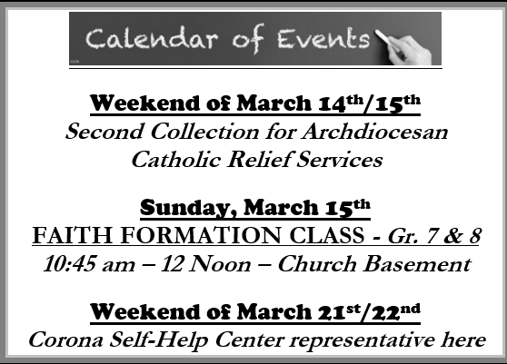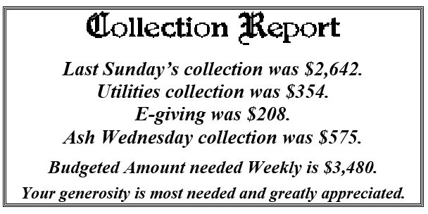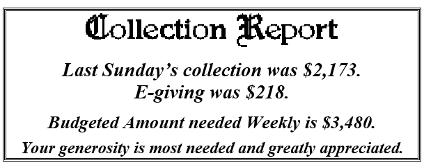 We have $6,680.00 pledged toward our Archdiocesan directed goal this year of $13,746. The Archdiocese has sent out letters to past donors announcing the 2026 Appeal. If you wish to participate you can either mail your pledge directly to the Archdiocese or you can put it in our collection and we will forward it for you. If you do decide to mail it in directly, we are asking that you let Sue know in the office so we can be sure our account is properly credited. You can drop a note in the collection, call the rectory, or send us an email. Thank you.